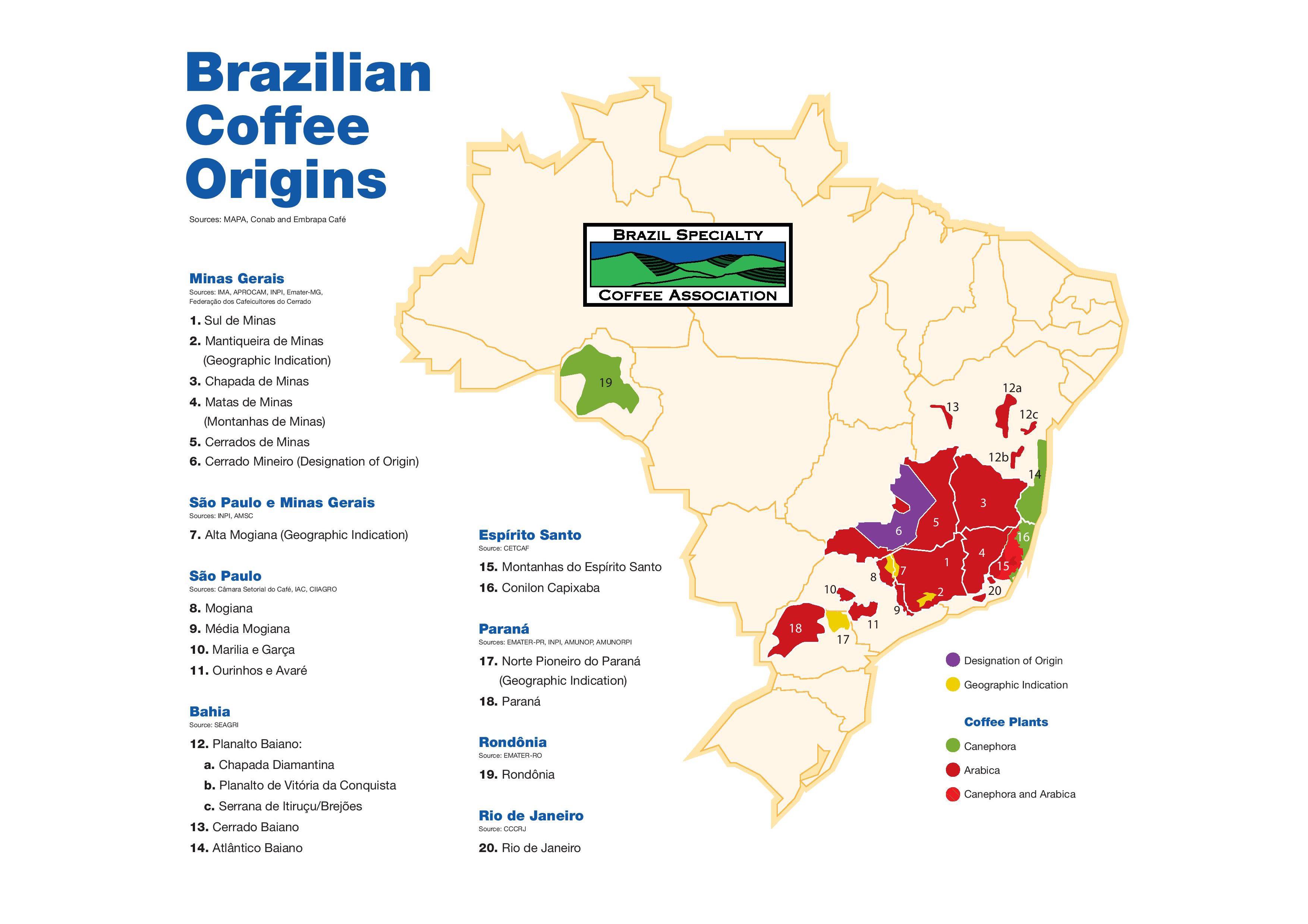 Mapa Brazílie kávu. Brazílie káva mapa (Jižní Amerika - Amerika), k tisku. Brazílie káva mapa (Jižní Amerika - Amerika) ke stažení.